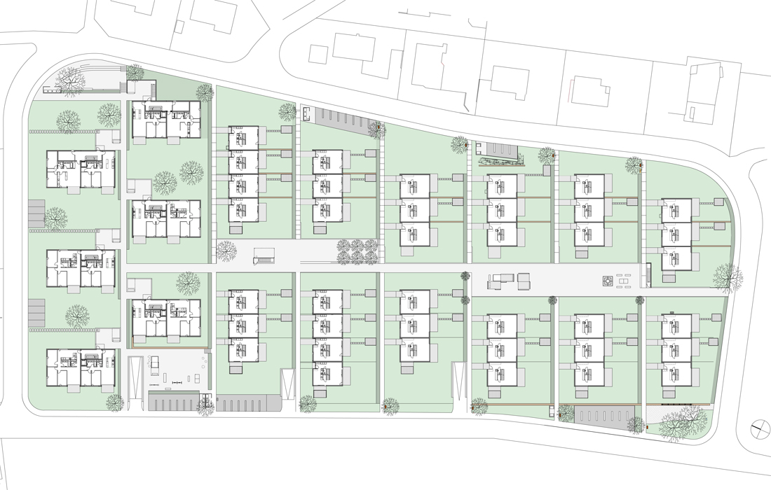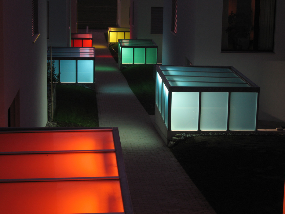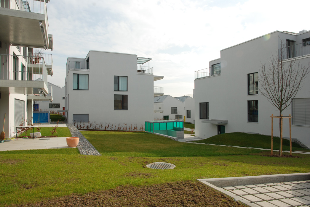 Drei Tiefgaragen, die alle von der Zubringerstrasse aus erschlossen sind, ermöglichen eine autofreie Siedlungsgestaltung. Oblichter erhellen die Garagen mit Tageslicht. |